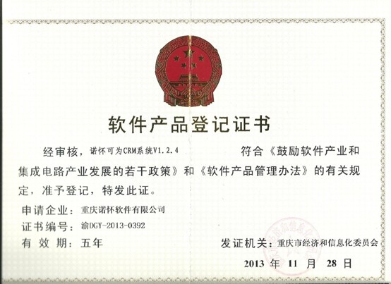 2013年11月,諾懷自主研發(fā)的“可為CRM系統(tǒng)”成功地通過了“工業(yè)和信息化部軟件產(chǎn)品登記”,正式成為了被國家認可的軟件產(chǎn)品。