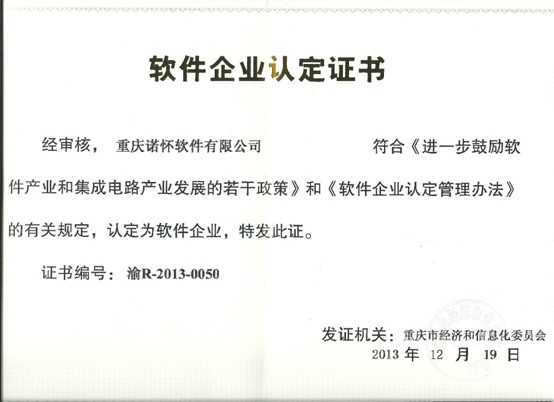 2013年12月,諾懷通過專家組的審核,被認為符合國家有關軟件企業(yè)的規(guī)定,成功獲得了“工業(yè)和信息化部軟件企業(yè)認定”證書。從此,諾懷軟件正式成為“雙軟企業(yè)”!