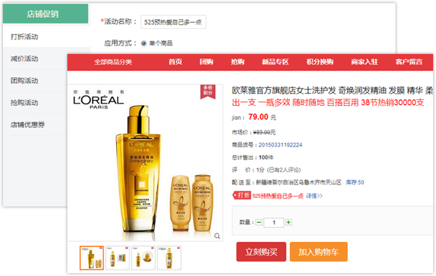 支持直降、滿減、組合購買、折扣、秒殺、團購、限時搶購等多種促銷方式